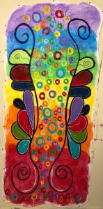 I continue to be amazed at how Spirit controls the pace at which my art gets finished. Things will delay me getting my art done so that different events and experiences can take place which then affect my art. This year, I didn’t finish my Soul Art Day project before going out of town to be in a wedding and then coming back to have dental surgery. But those were just divine timing to delay getting my art done for what really needed to occur. The day before I finished my art, we had a Soul Art monthly ritual in the certification program. That ritual caused me great turmoil which I turned around and poured into my art. I needed the experience of that ritual to loosen up all of that stuff that was stuck inside of me in order to express it in my art. It was only after I expressed all of that pain on my art that the healing occurred and I could fully see my art in its full power – that beautiful rainbow channel. Without those synchronistic delays, I wouldn’t have been able to release that old pain into my art or receive the full transmission of the healing that occurred. This kind of stuff happens quite frequently for me with Soul Art and I have learned to trust the process and relax into the timing of how each piece wants to be completed.